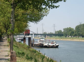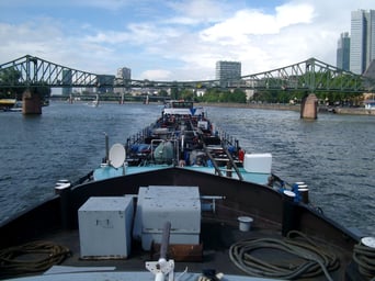 In der Schleuse Eddersheim stand dann plötzlich mein Freund da. Wir fuhren nun an dem Hafen von Kelsterbach vorbei. Hier werden die grossen Tankschiffe mit Jet-Petrol für den Flughafen von Frankfurt gelöscht. Wir passierten die chemischen Fabriken von Hoechst.