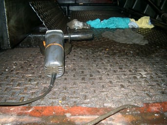 02.09.2004 am späten Nachmittag kam mein Freund wieder an Bord. Zuerst wurden die Gasöltanks endgereinigt, dann kam die Ecke im Maschinenraum mit dem Batteriehalter dran. Im Anschluss machte er sich an die Reinigung der Flurplatten. Diese sind von einer zähen, undefinierbaren Masse bedeckt. Mit Gasöl, Drahtbürste, Lappen und Kraft rückt er dem Dreck zu Leibe.